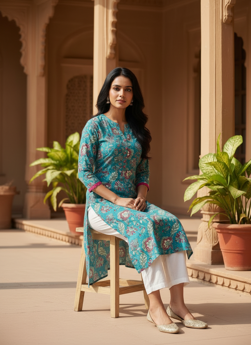 Elevate your look with this stunning teal floral cotton kurta, blending vibrant color with classic style. Made from soft, high-quality cotton, this piece offers superior comfort and breathability for all-day wear. The rich teal base features an intricate multi-color floral print in shades of red and blue, creating a luxurious, detailed pattern. The kurta is beautifully accented with bold pink lace detailing along the round neckline and the cuffs of the three-quarter sleeves, adding a playful pop of contrast. With its flattering straight fit, this versatile kurta is perfect for festive gatherings, office wear, or sophisticated casual occasions, ensuring you look effortlessly chic.